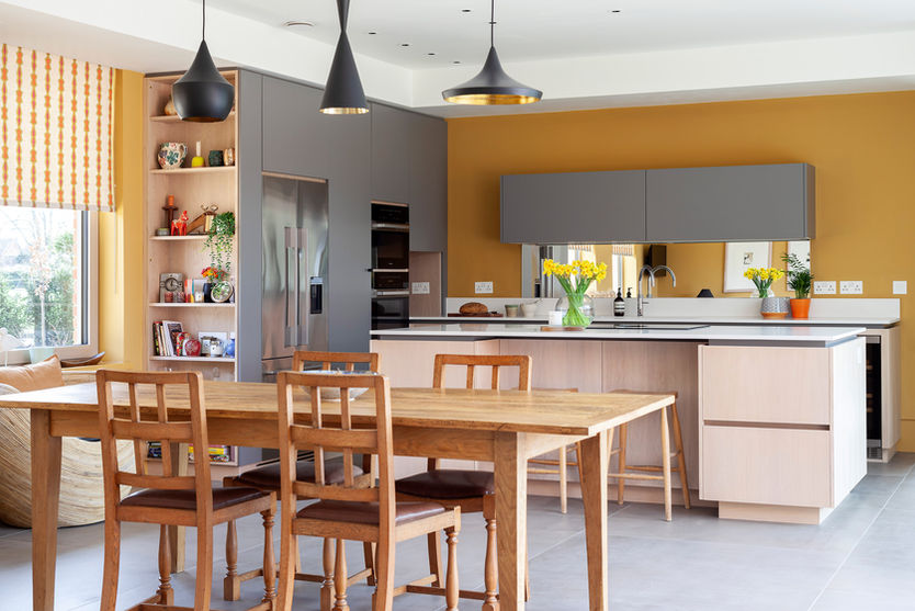 Open storage adds depth to the design, while grey doors provide a sophisticated counterpoint to the bold mustard yellow walls. With carefully integrated appliances ensuring ease of use, this vibrant space embraces both character and modernity—an eco-home kitchen that is as stylish as it is functional.